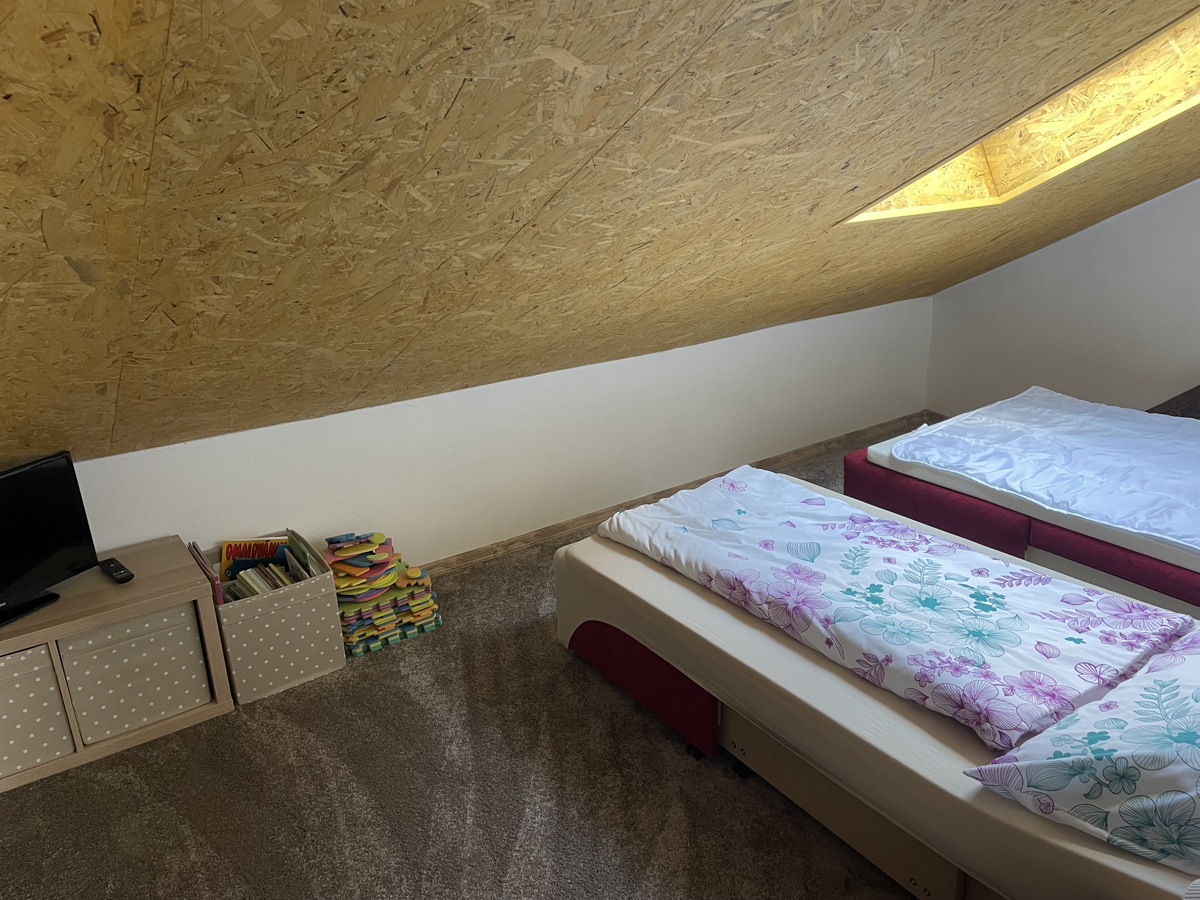 Pokoj má manželskou postel. Dvě jednolůžkové postele a hrací koutek se nachází na půdě.